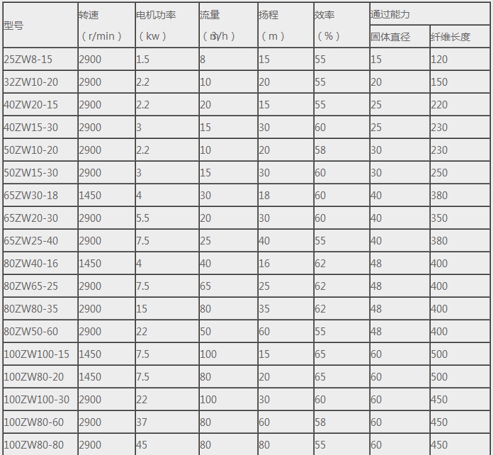 ZW型自吸排污泵是本厂工程技术人员吸收国外技术,结合我国机电行业的实际情况而研制成功的。该泵通过叶轮和泵体的新颖结构,既可象一般自吸泵那样不需要安装底阀,又可以通过较大颗粒和较长的纤维,具有广阔的应用市场和发展前景。ZW型自吸式排污泵,又称固液泵或杂质泵。该系列泵水力设计独特,叶轮是缩在单独的叶轮室内,连接叶轮室的是压水室,当叶轮旋转时,泵内液体产生强烈的轴向涡流作用,使进口造成真空,出口产生扬程。因而杂质可以从压水室排出,所以它的流道是完全畅通的,其排污效果是其他自吸式排污泵无可比拟的。本单位生产的ZW自吸排污泵机可象一般自吸清水泵那样不需要安装底阀,又可吸排含有大颗粒固体块、长纤维、沉淀物、废矿杂质、粪便处理及一切工程污水物。自吸排污泵可广泛适用于市政排污工程、轻工、造纸、纺织、食品、化工、电业、石油、矿山和河塘养殖等行业。自吸排污泵是目前国内抽送固体颗粒、纤维、浆料和混合悬浮等介质最理想的杂质泵。自吸排污泵性能范围流量Q:8~800 m³/h 自吸排污泵口径DN:25~300mm自吸排污泵 扬程H:15~80m 自吸排污泵转速N:2900~1450r/min 自吸排污泵电机功率:1.5~55kw
